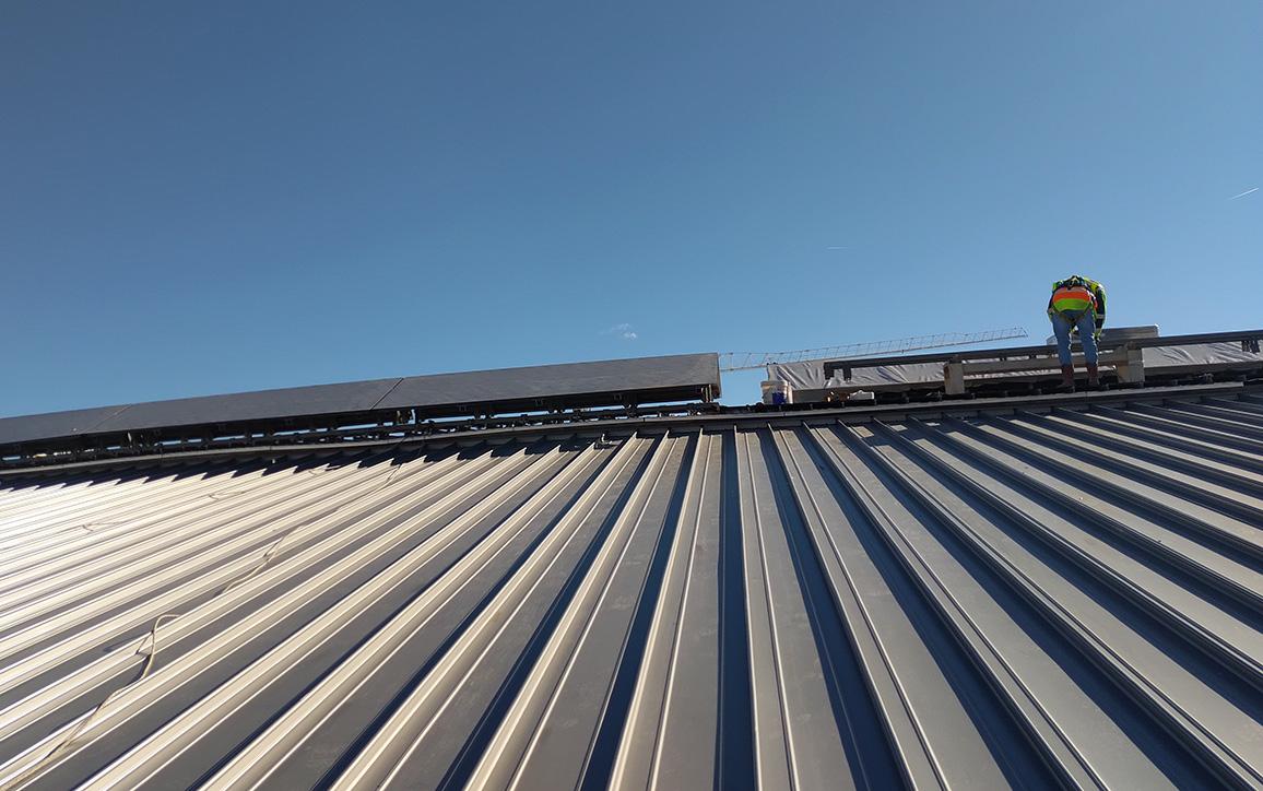 Os módulos, em forma de lâminas, são compostos por uma estrutura de perfis de alumínio ancorados aos nervos da cobertura em Kalzip que, por sua vez, suportam o revestimento em chapa de aço inoxidável - o aspeto final metálico projetado pelo arquiteto.